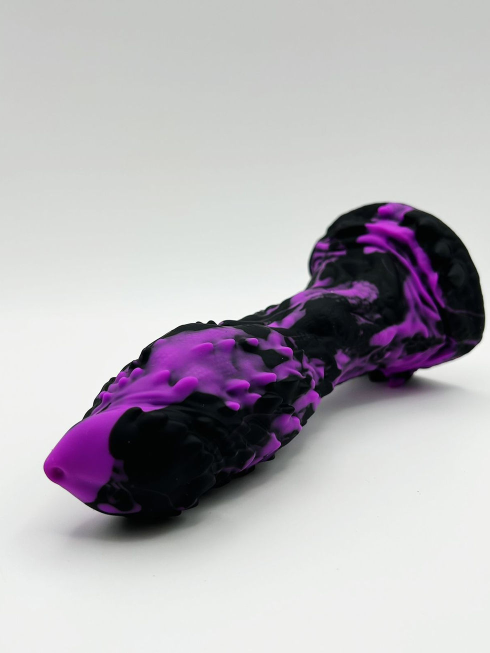 Consolador de fantasía: Este consolador morado y negro es grueso, amenazante y texturizado con bultos, crestas, surcos y puntas puntiagudas.